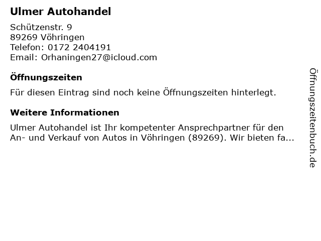 | Öffnungszeiten Ulmer Autohandel in Vöhringen anzeigen | |