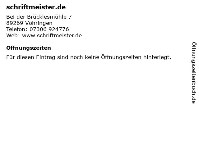 | Öffnungszeiten schriftmeister.de in Vöhringen anzeigen | |