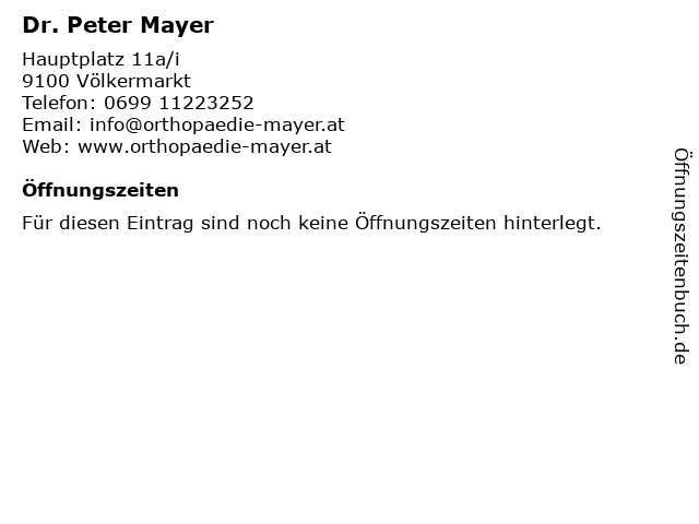 | Öffnungszeiten Dr. Peter Mayer in Völkermarkt anzeigen | |