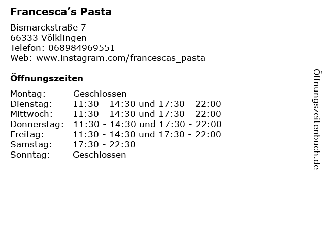 | Öffnungszeiten Francesca’s Pasta in Völklingen anzeigen | |
