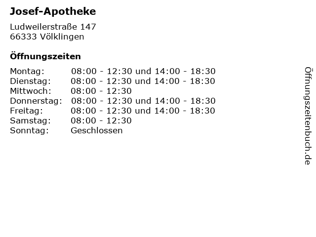 | Öffnungszeiten Josef-Apotheke in Völklingen anzeigen | |