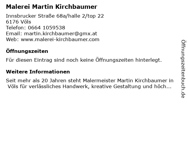 | Öffnungszeiten Malerei Martin Kirchbaumer in Völs anzeigen | |