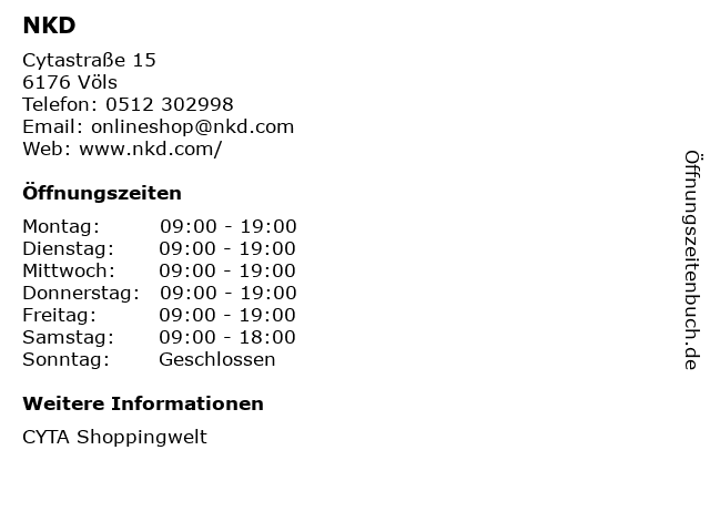 | Öffnungszeiten NKD in Völs anzeigen | |