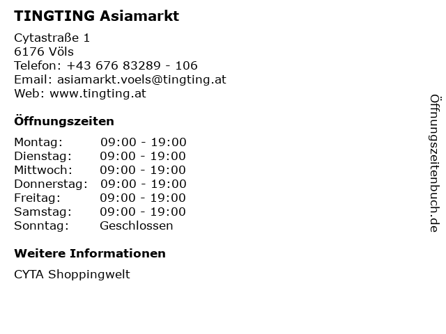 | Öffnungszeiten TINGTING Asiamarkt in Völs anzeigen | |