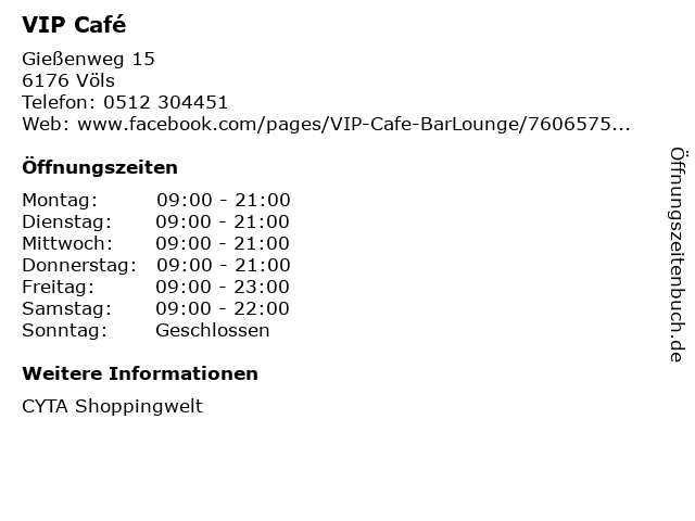 | Öffnungszeiten VIP Café in Völs anzeigen | |