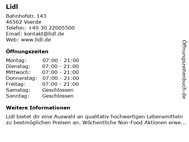 | Öffnungszeiten Lidl in Voerde anzeigen | |