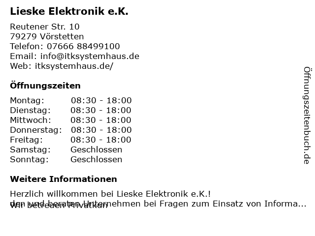 | Öffnungszeiten Lieske Elektronik e.K. in Vörstetten anzeigen | |