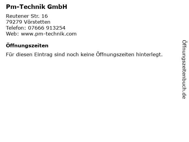 | Öffnungszeiten Pm-Technik GmbH in Vörstetten anzeigen | |