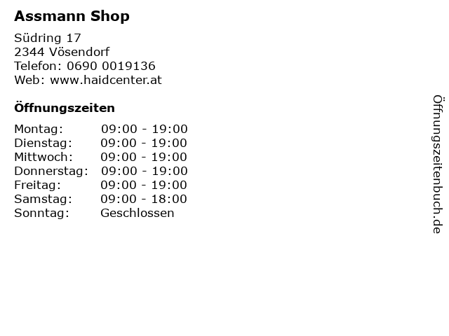| Öffnungszeiten Assmann Shop in Vösendorf anzeigen | |