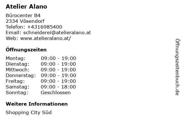| Öffnungszeiten Atelier Alano in Vösendorf anzeigen | |