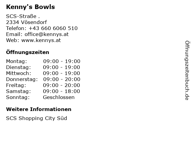 | Öffnungszeiten Kenny's Bowls in Vösendorf anzeigen | |