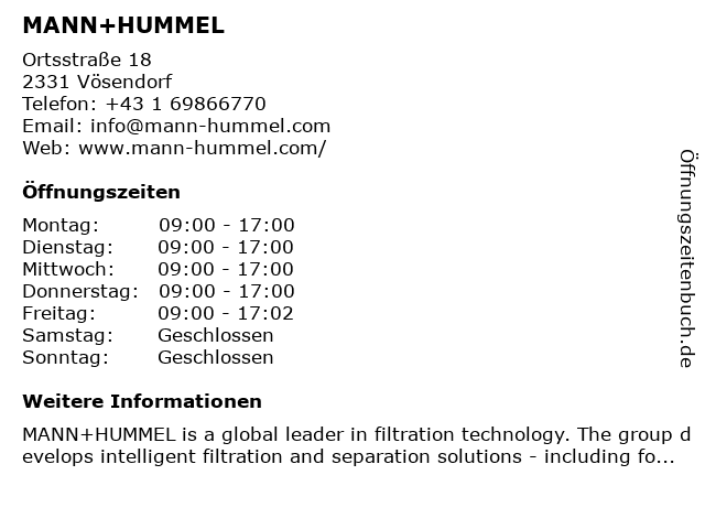 | Öffnungszeiten MANN+HUMMEL in Vösendorf anzeigen | |