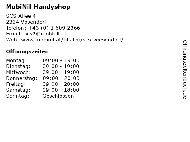 | Öffnungszeiten MobiNil Handyshop in Vösendorf anzeigen | |