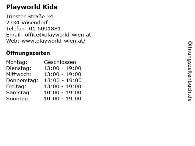 | Öffnungszeiten Playworld Kids in Vösendorf anzeigen | |