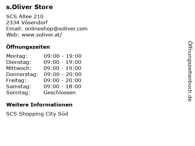 | Öffnungszeiten s.Oliver Store in Vösendorf anzeigen | |