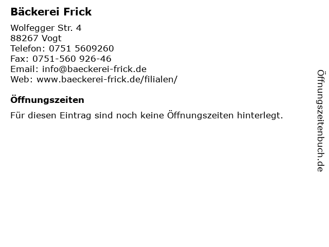| Öffnungszeiten Bäckerei Frick in Vogt anzeigen | |