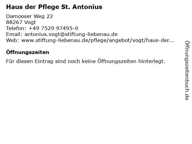 | Öffnungszeiten Haus der Pflege St. Antonius in Vogt anzeigen | |