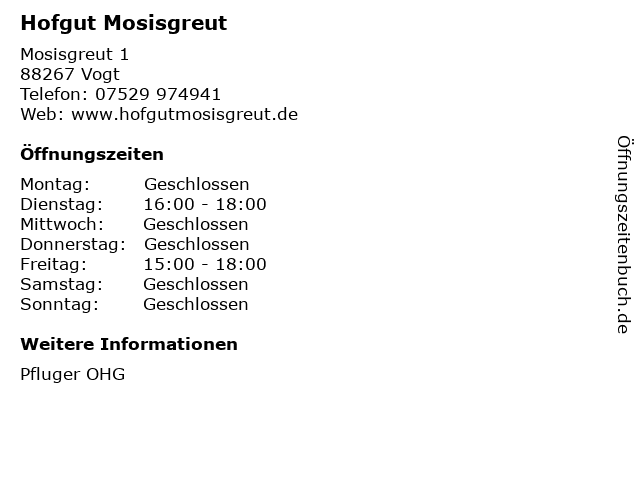 | Öffnungszeiten Hofgut Mosisgreut in Vogt anzeigen | |