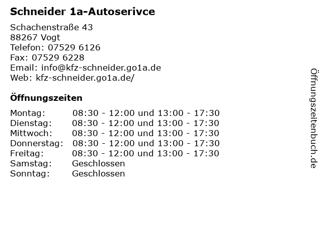 | Öffnungszeiten Schneider 1a-Autoserivce in Vogt anzeigen | |