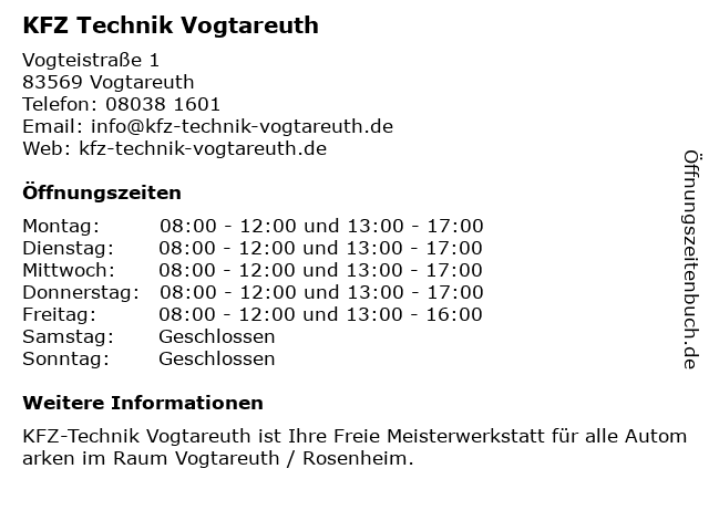| Öffnungszeiten KFZ Technik Vogtareuth in Vogtareuth anzeigen | |