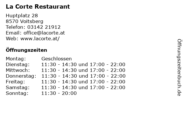 | Öffnungszeiten La Corte Restaurant in Voitsberg anzeigen | |
