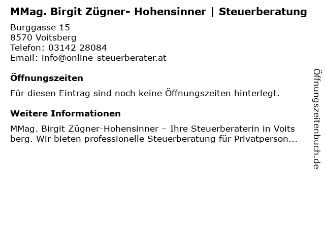Branchen & Suchbegriffe zu MMag. Birgit Zügner- Hohensinner | Steuerberatung:birgit, hohensinner, mmag., schuldeneintreibungsdienste, steuerberatung, zügner |