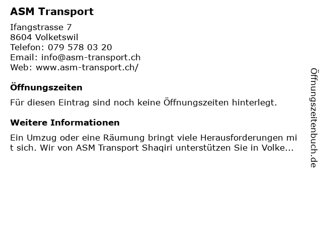 | Öffnungszeiten ASM Transport in Volketswil anzeigen | |