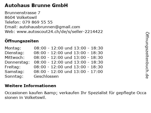 Öffnungszeiten Autohaus Brunne GmbH in Volketswil anzeigen | |