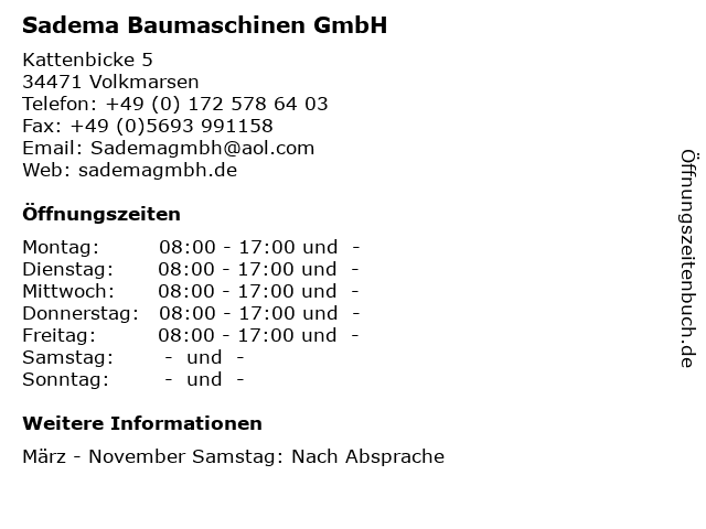 3 Sadema GmbH - Geräte und Baumaschienen Verleih (Entfernung: 0,40 km) Lütersheimerstraße 32 - 34, 34471 Volkmarsen 4 König Baumaschinen Maria Elisabeth Baumaschinenhandel (Entfernung: 8,91 km) Am Waldwinkel 2, 34414 Warburg 5 Rosenstein Baumaschinen Handelsgesellschaft mbH (Entfernung: 10,75 km) Obere Hilgenstock 1, 34414 Warburg 6 |