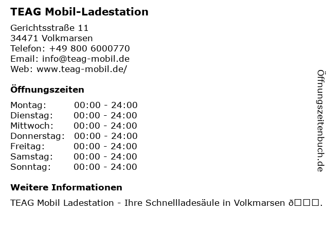 | Öffnungszeiten TEAG Mobil-Ladestation in Volkmarsen anzeigen | |