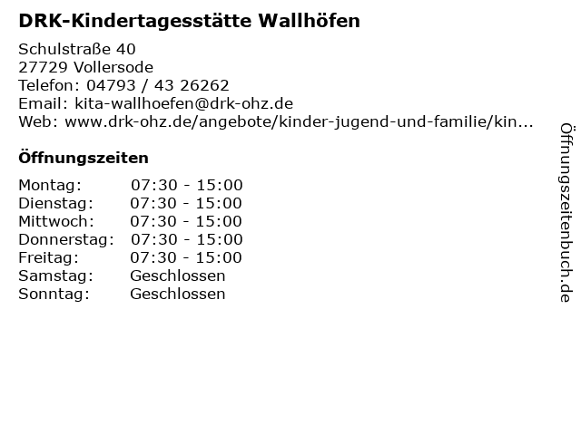 1 Kirsten-Boie-Grundschule Wallhöfen - Sekretariat (Entfernung: 0,21 km) Wallhöfener Str. 12, 27729 Vollersode 6 DRK-Tagesstätte für Kinder mit Behinderung Kirchwistedt (Entfernung: 11,19 km) Lindenallee 3, 27616 Beverstedt |