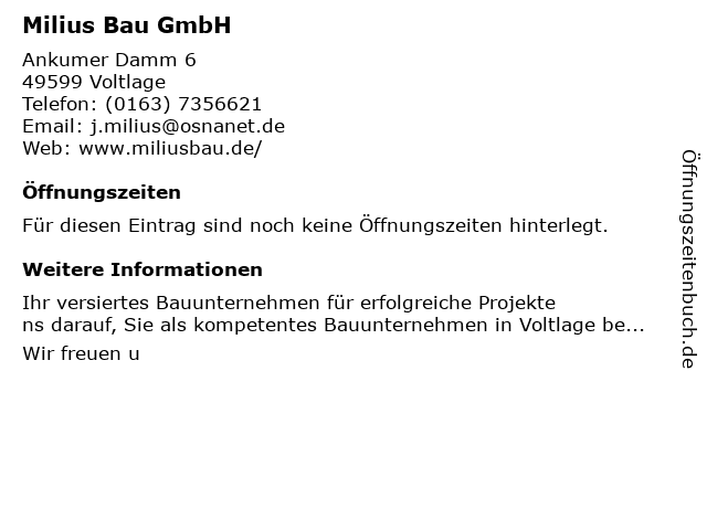 | Öffnungszeiten Milius Bau GmbH in Voltlage anzeigen | |