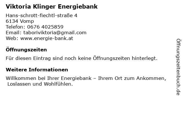 | Öffnungszeiten Viktoria Klinger Energiebank in Vomp anzeigen | |