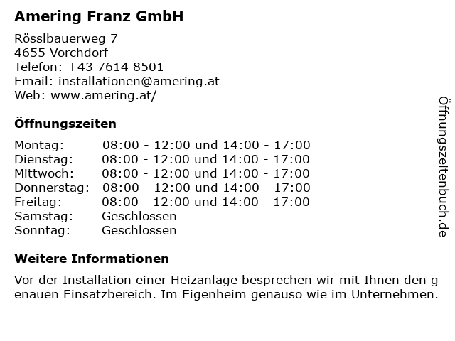 | Öffnungszeiten Amering Franz GmbH in Vorchdorf anzeigen | |