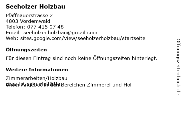 | Öffnungszeiten Seeholzer Holzbau in Vordemwald anzeigen | |