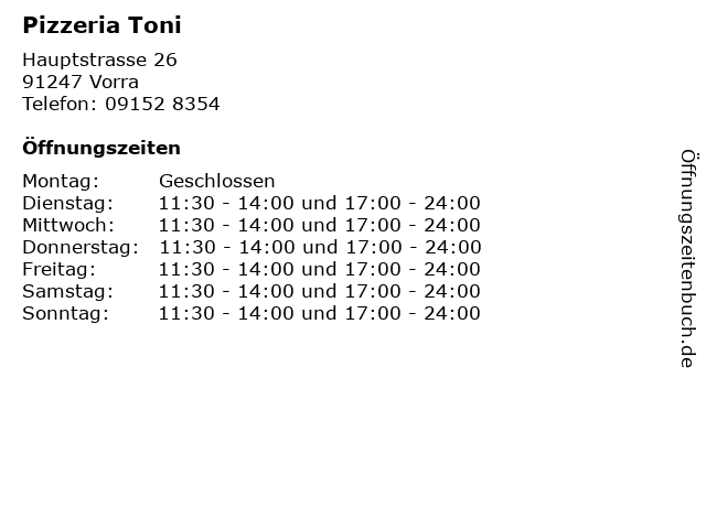 | Öffnungszeiten Pizzeria Toni in Vorra anzeigen | |
