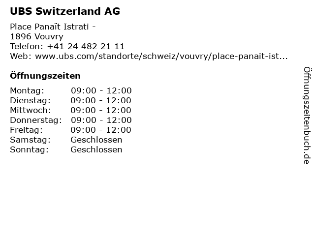 | Öffnungszeiten UBS Switzerland AG in Vouvry anzeigen | |
