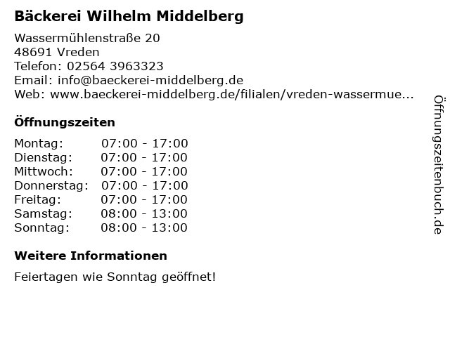 | Öffnungszeiten Bäckerei Wilhelm Middelberg in Vreden anzeigen | |