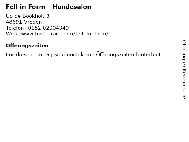 | Öffnungszeiten Fell in Form - Hundesalon in Vreden anzeigen | |