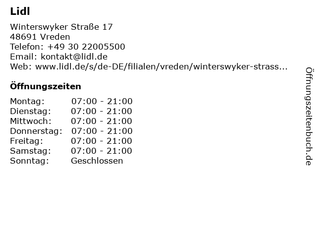 | Öffnungszeiten Lidl in Vreden anzeigen | |