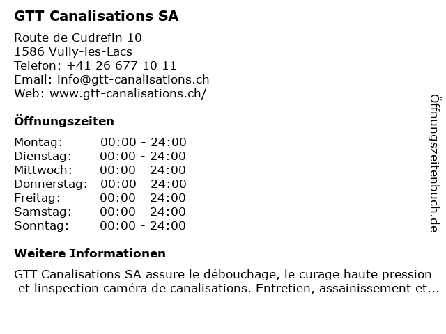 | Öffnungszeiten GTT Canalisations SA in Vully-les-Lacs anzeigen | |
