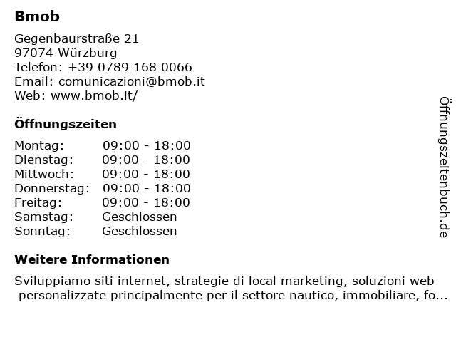 | Öffnungszeiten Bmob in Würzburg anzeigen | |