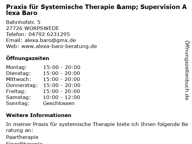 Branchen & Suchbegriffe zu Praxis für Systemische Therapie & Supervision Alexa Baro:alexa, baro, lebenscoaching, praxis, supervision, systemische, therapie  |