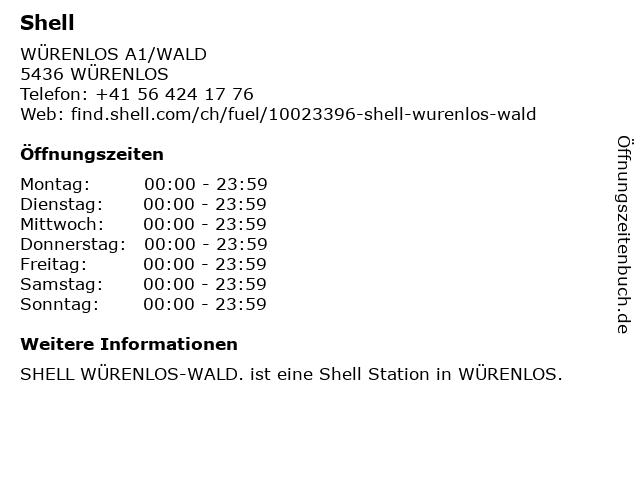 | Öffnungszeiten Shell in WÜRENLOS anzeigen | |