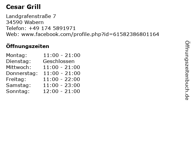 | Öffnungszeiten Cesar Grill in Wabern anzeigen | |