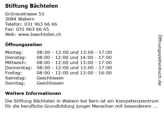 | Öffnungszeiten Stiftung Bächtelen in Wabern anzeigen | |