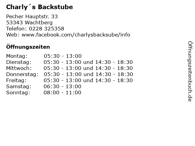 | Öffnungszeiten Charly´s Backstube in Wachtberg anzeigen | |