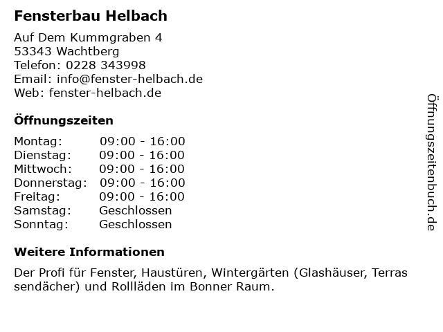 | Öffnungszeiten Fensterbau Helbach in Wachtberg anzeigen | |