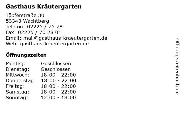 | Öffnungszeiten Gasthaus Kräutergarten in Wachtberg anzeigen | |