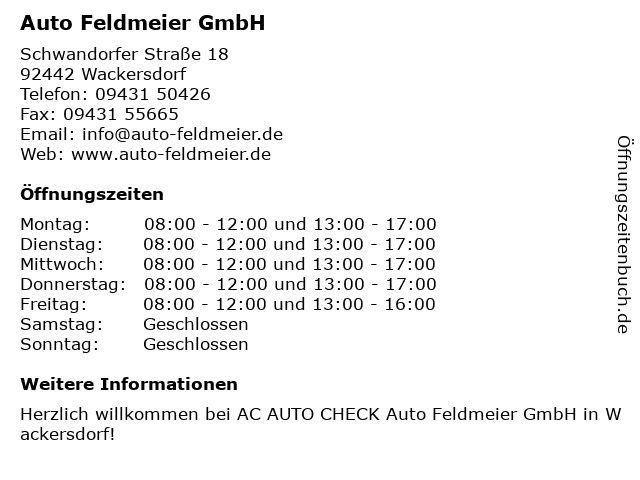 | Öffnungszeiten Auto Feldmeier GmbH in Wackersdorf anzeigen | |